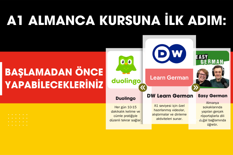 • DW Learn German (Deutsche Welle): A1 seviyesi için özel hazırlanmış videolar, alıştırmalar ve dinleme aktiviteleri sunar.