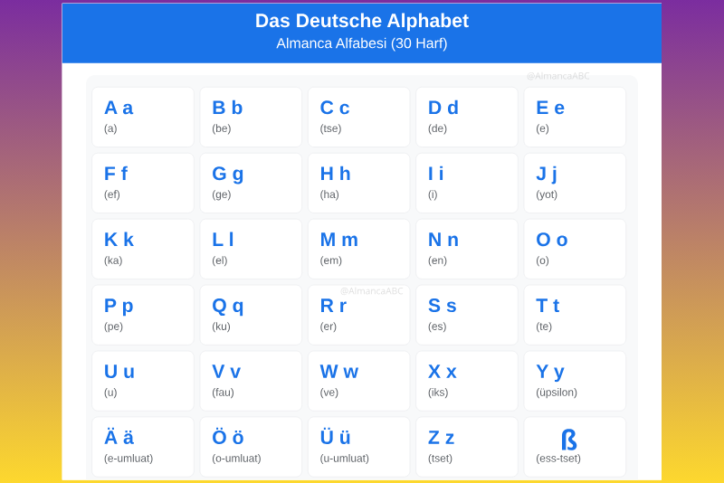 Almanca’da Türkçede olmayan sesler vardır: ä, ö, ü, ß gibi harfleri öğrenmek çok önemlidir. YouTube’da kısa videolarla veya ücretsiz alfabe uygulamalarıyla telaffuz pratiği yapabilirsiniz.